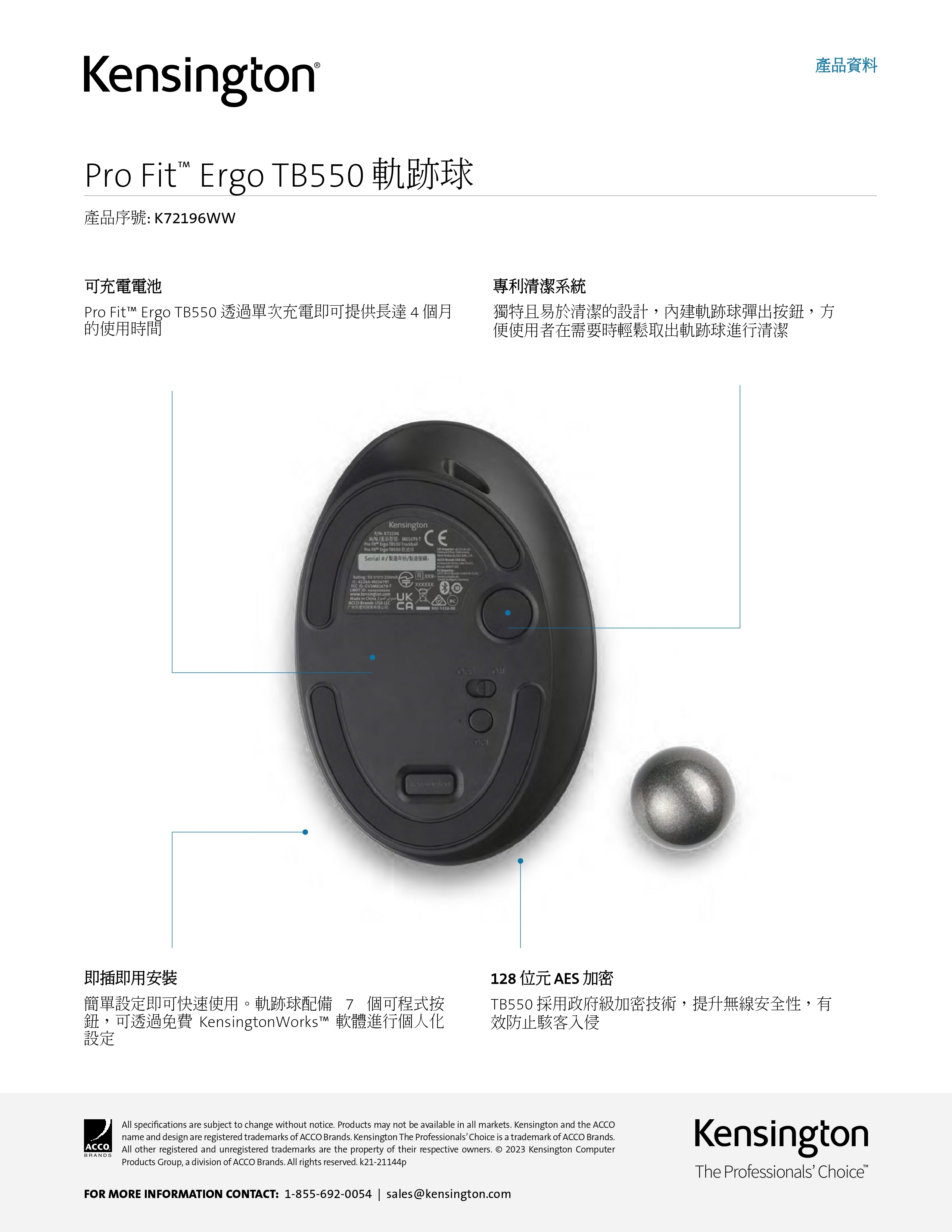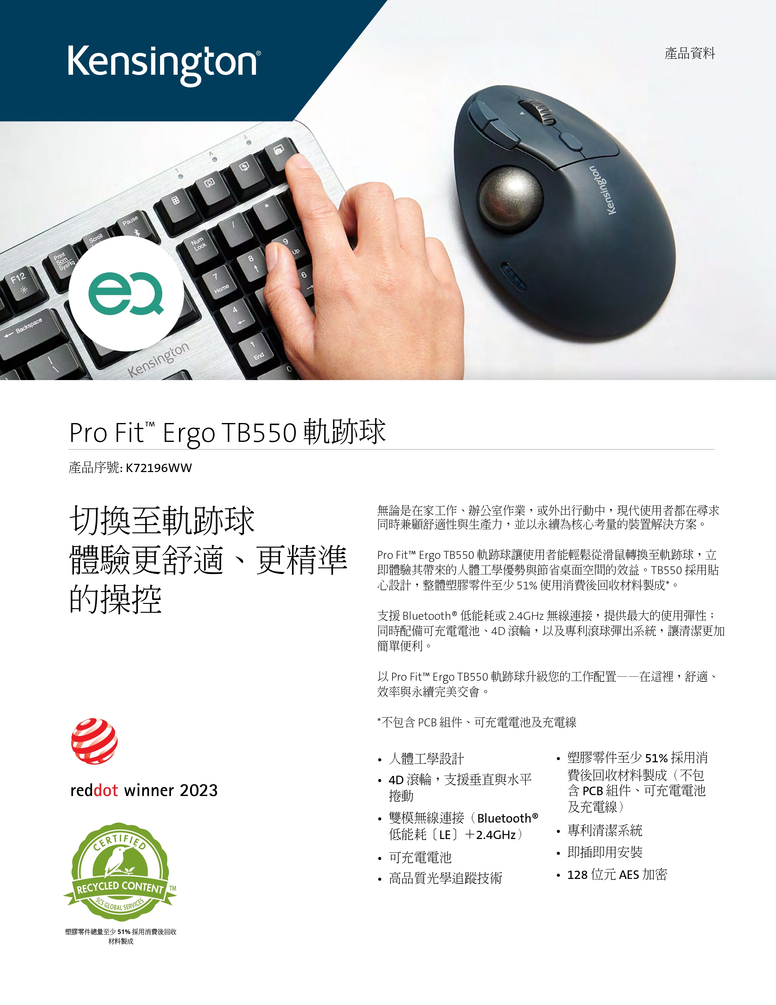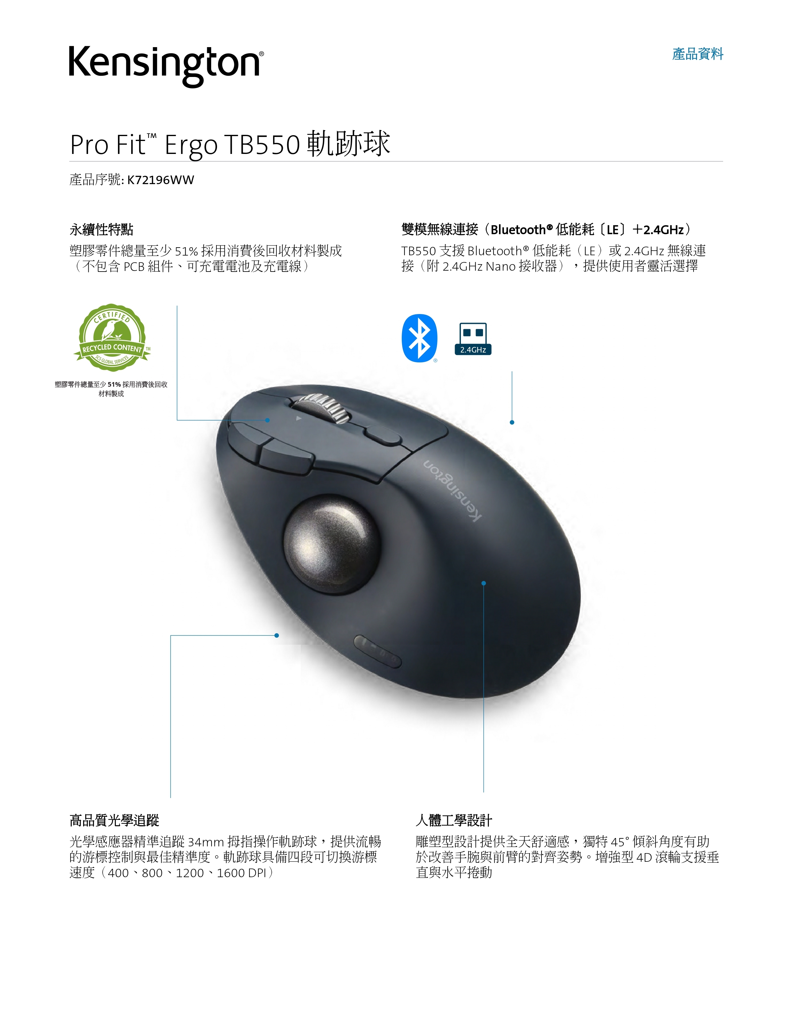 TB550 人體工學無線拇指軌跡球滑鼠 (K72196)