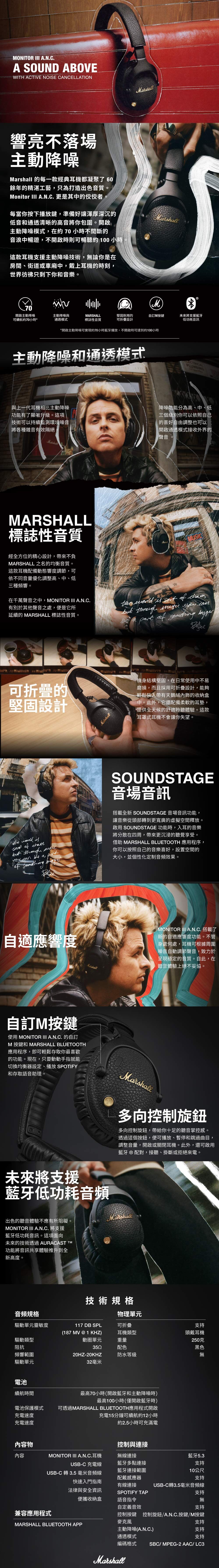🎵Marshall 標誌音質 :可依不同音量優化調整高、中、低三種頻響,呈現均衡優異的音效