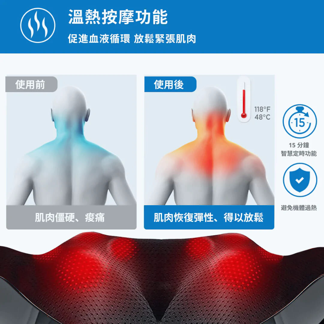 ⭐加熱功能可溫暖身體,改善血液循環,同時放鬆緊張的肌肉