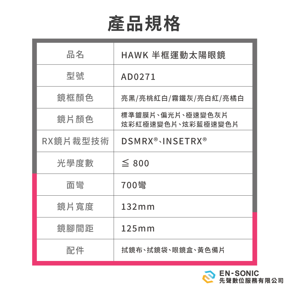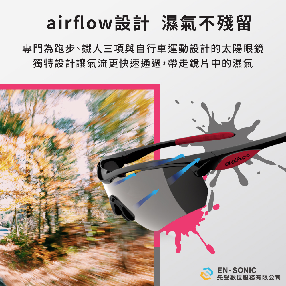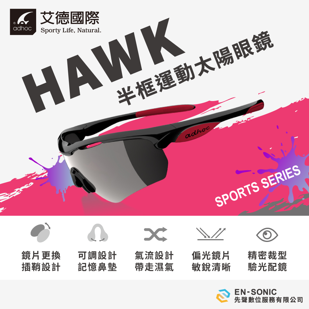 HAWK 以獵鷹高速俯衝掠食的衝勁當作靈感,參考展翅俯衝的線條成為鏡框的流線設計,不僅讓造型更加亮眼,更可以降低風阻影響。可調式鏡腳跟鼻墊也能根據不同的頭型進行調整,讓眼鏡服貼不會輕易滑動。搭配上ADHOC 專利設計的 i-LOCK 鏡片插鞘扣槽設計,使鏡片與鏡框連接地更為緊密牢固。此外,鏡片上方特殊設計的氣孔能將人體產生的熱氣往外排出,避免運動時產生的霧氣影響視線。HAWK 的多重設計都是確保在運動時能夠輕鬆自如,讓您無論面對什麼樣的運動及挑戰,只要戴上它,隨時都是蓄勢待發的絕佳狀態。