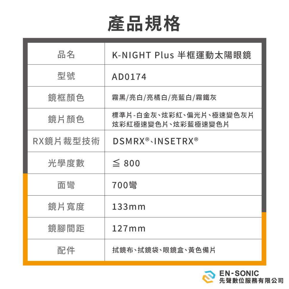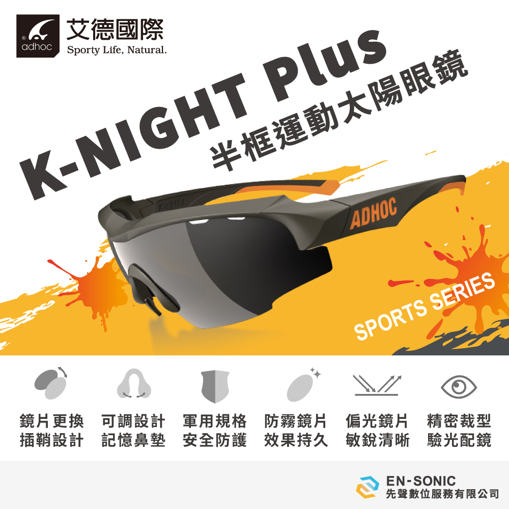 擁有 ADHOC 極緻工藝技術打造出的堅實耐用框型與軍用規格安全防護,黑武士 K-NIGHT 是您在從事戶外運動最舒適安全的選擇。K-NIGHT Plus 採用可調式鏡腳與止滑設計,能依個人臉型隨意調整也能防止鏡腳滑落。