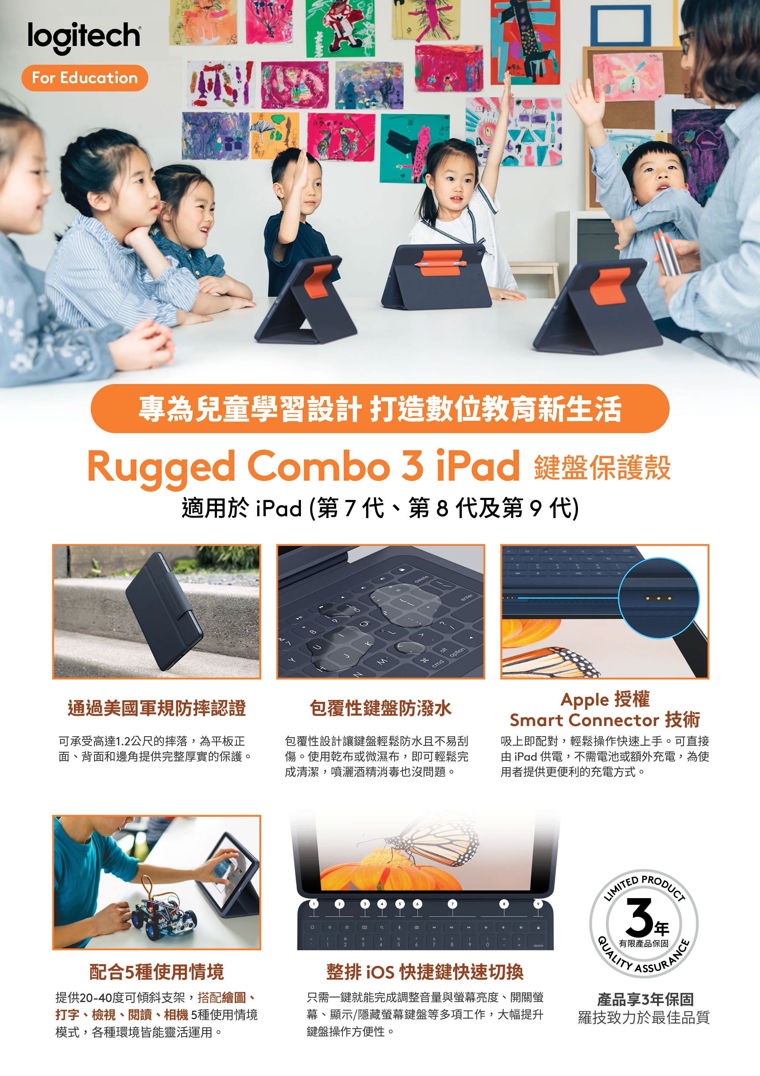 🔹Logitech 的 Rugged Folio 保護殼配備一體化鍵盤,採用吸震材質,超越軍規掉落測試標準,為 iPad 提供全面保護。它有打字、觀看、塗鴉和閱讀四種模式,方便隨時隨地使用。Rugged Folio 透過聰穎接點與 iPad 連接,無需配對或充電。它還附有筆套,便於攜帶 Apple Pencil 或 Logitech Crayon。