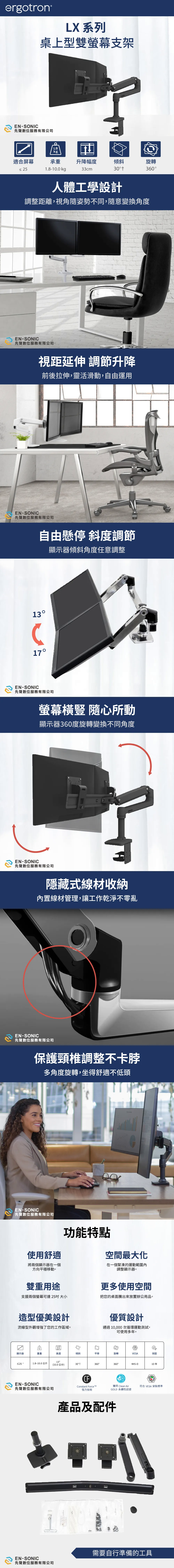 個別獨立的支架,可輕鬆的切換橫向/縱向模式,或將雙螢幕從並排配置調整為上下堆疊配置。