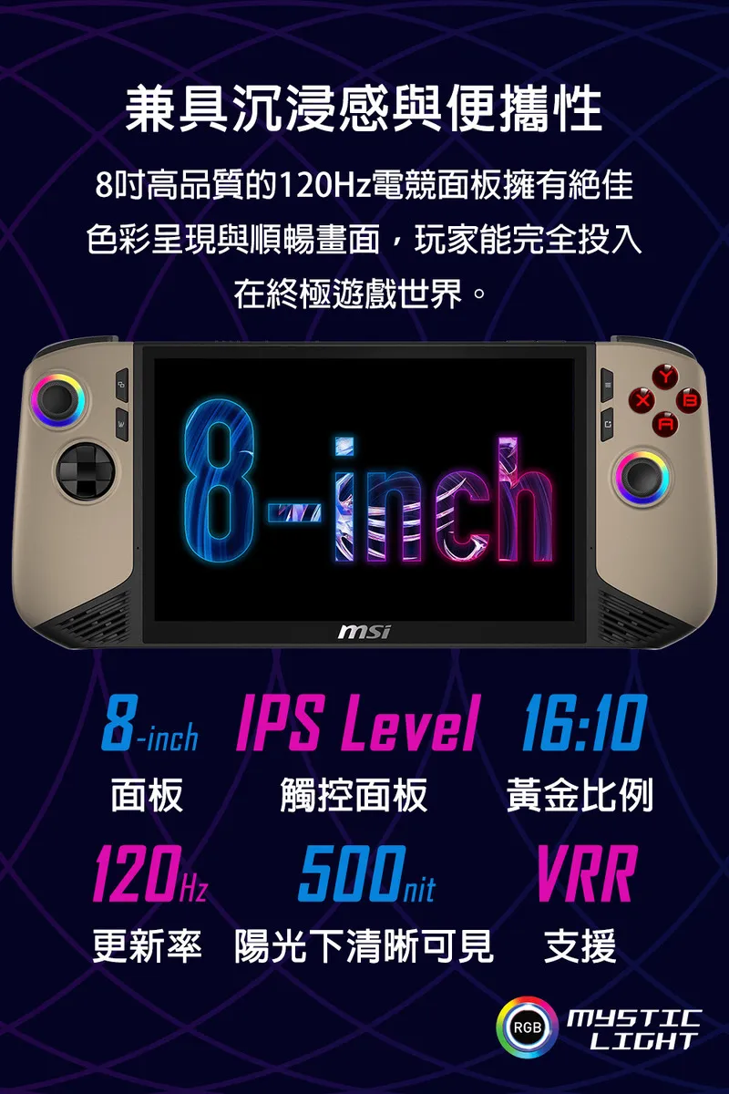 ★8吋FHD (1920 x 1080), 120 Hz 更新率, 可觸控, 100% sRGB (Typical), 500nits (Typical), VRR, IPS等級面板