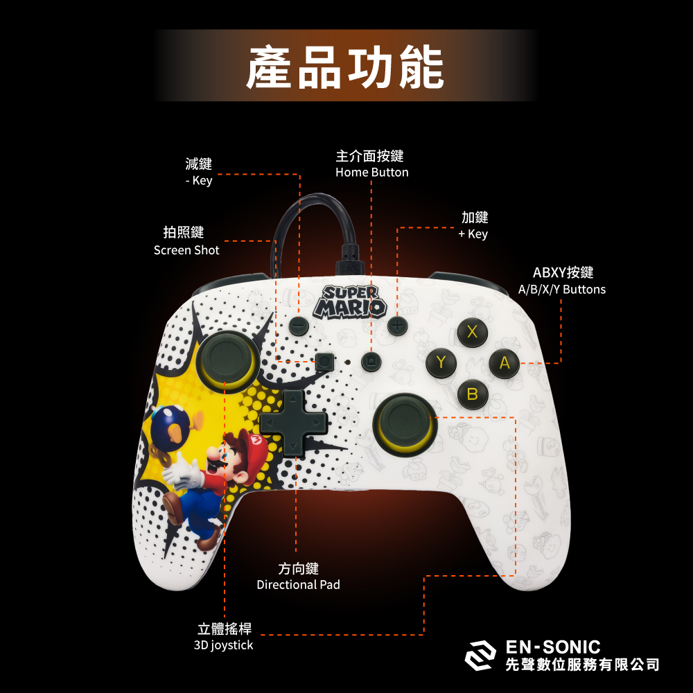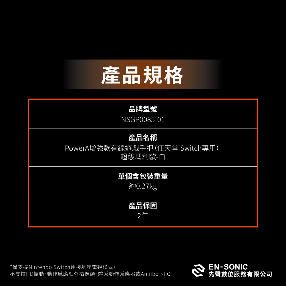 *僅支援Nintendo Switch連接基座電視模式。不支持HD振動、動作感應紅外攝像頭、體感動作感應器或Amiibo NFC