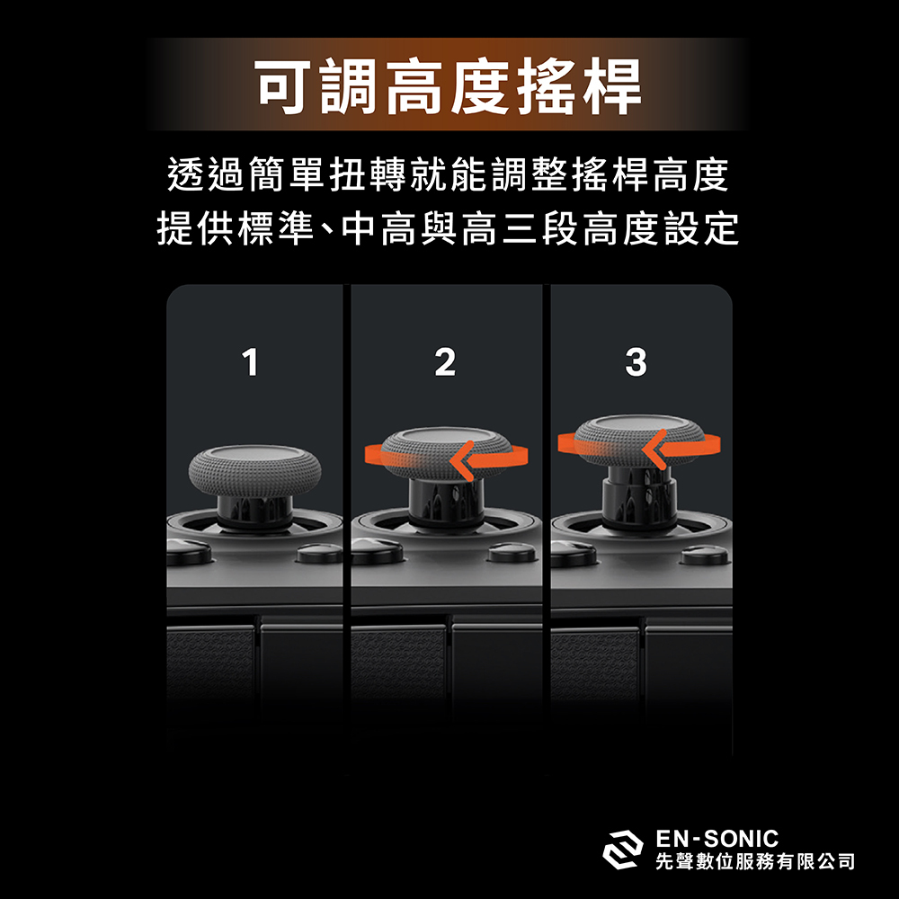 •快速扭轉拇指桿 – 在遊戲過程中只需簡單扭轉即可輕鬆調整每個拇指桿的高度:無需更換零件。 3種高度設定:標準、中、高